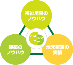 「えるふ」では、各ご家庭の家族構成、介護の必要な方の状態に合わせ、リフォームのみや、福祉用具のみに頼る事なく、その両方をうまく組み合わせた効率の良い提案をさせていただきます。建築の技術と、福祉の知識、地元密着の確かな実績を元に、「あなたにピッタリ」をご提案します。